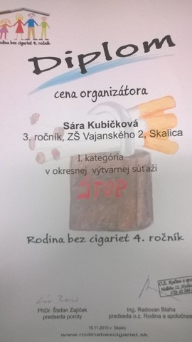 Žiaci našej školy sa zapojili do výtvarnej súťaže Rodina bez cigariet. Tento rok prebiehal 4.ročník súťaže a v 1.kategórii v okresnej súťaži vyhrala Cenu organizátora Sára Kubíčková, žiačka 3.A triedy. Okrem toho, že všetci dobre vieme, že cigarety škodia zdraviu, sa Sára mohla potešiť z milých cien, ktoré dostala pri vyhodnotení súťaže v MAX-e v Skalici dňa 19.11. 2015. Teraz právom chodí v tričku, na ktorom má svoju vlastnú kresbu.