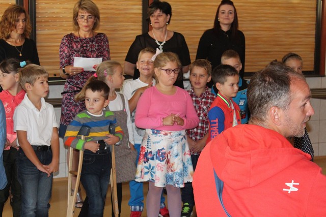 V jedálni školy netrpezlivo očakávali príchod svojej pani učiteľky naši prváci, ich rodičia i starí rodičia. Privítal ich riaditeľ školy a primátor mesta.