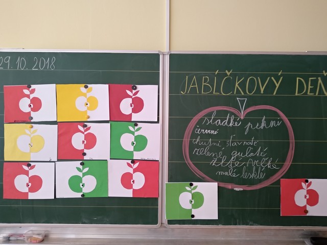 Ako každý rok aj tento sa žiaci I. stupňa u nás zapojili do jabĺčkového dňa, ktorý sa konal v pondelok 29. 10. Deti vyrábali jesenné klobúky, písali básničky o jabĺčku, spievali o ňom, súťažili s jabĺčkami v tanci, skokoch, ochutnávali jablkové koláče, vytvárali jablkové projekty, kreslili ich, tvorili jablkové venčeky z papiera a tak si samozrejme pripomenuli, že jablko je zdravé a plné vitamínov, ktoré nám v jesennom období tak veľmi chýbajú.