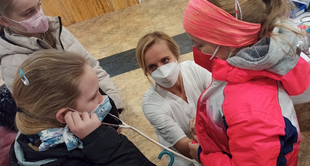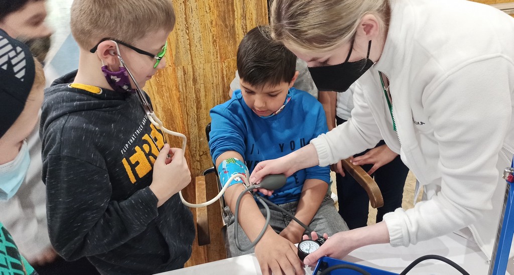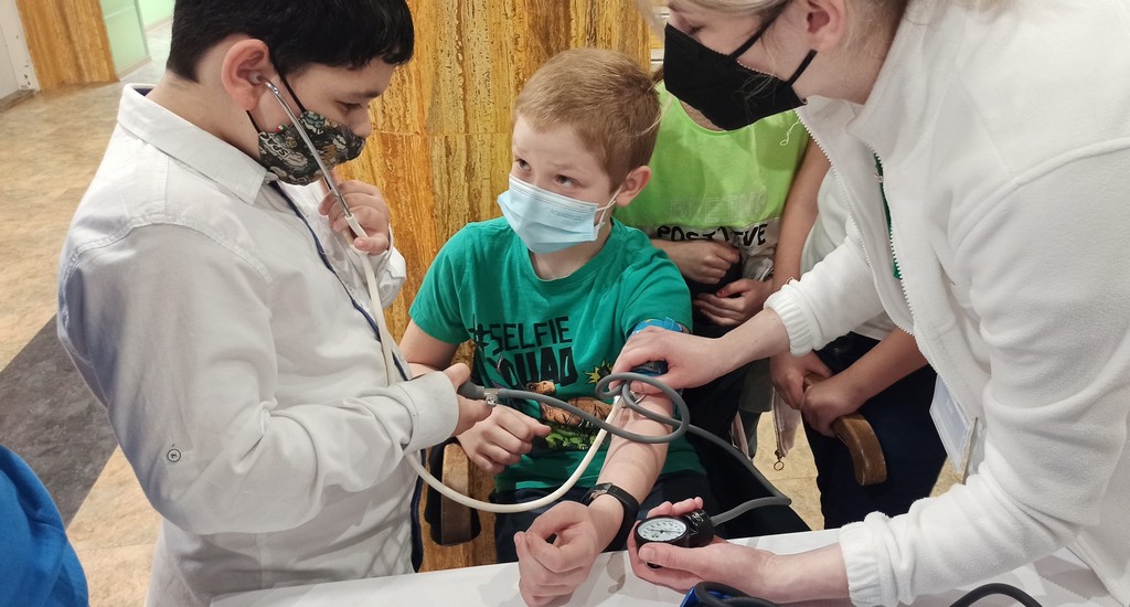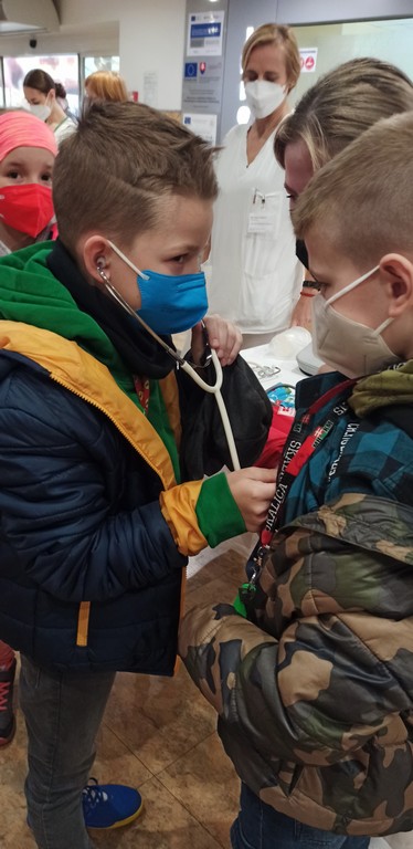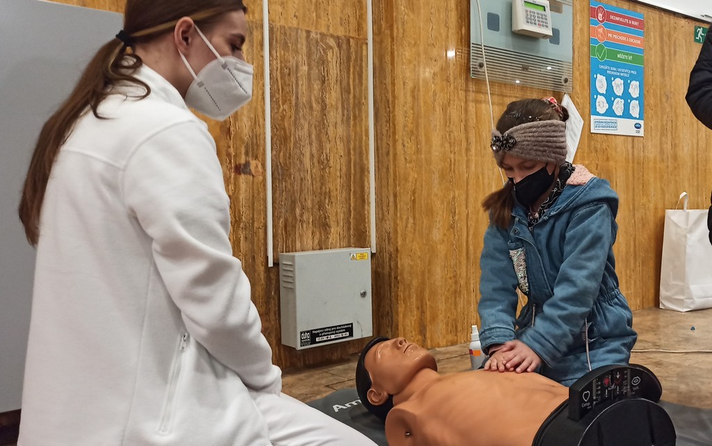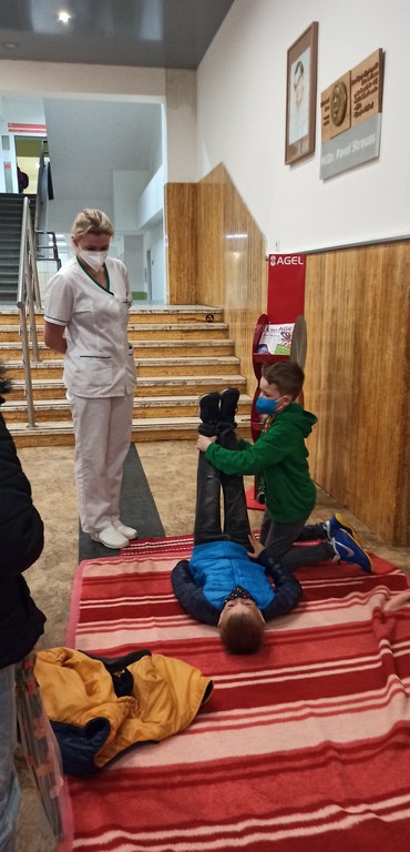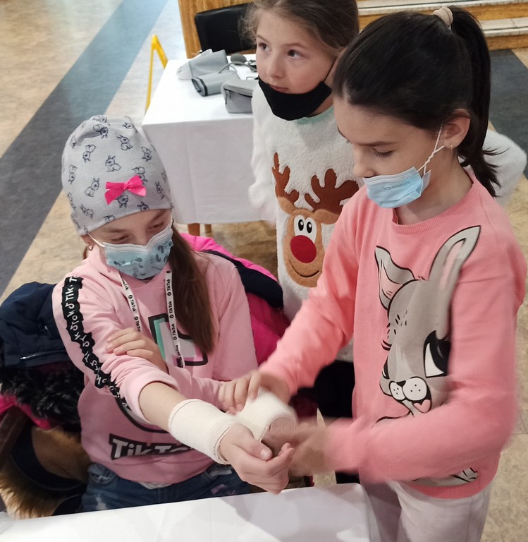 V štyroch skupinách žiaci prechádzali stanovišťami, na ktorých si vyskúšali obväzovanie, meranie tlaku, prácu s fonendoskopom. Naučili sa ako sa dáva umelé dýchanie a čo je stabilizovaná poloha.