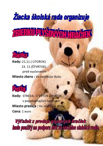 Žiacka školská rada organizuje v utorok a štvrtok (21. 11. a 23. 11.) pred vyučovaním vo vestibule školy zbierku plyšových hračiek.